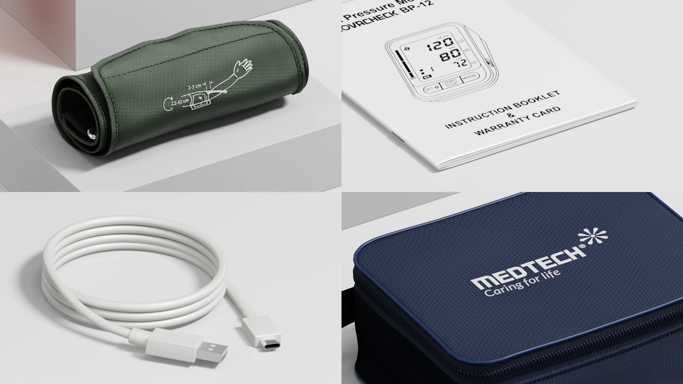 3D Modeling- Product, manual, charging cable, BP monitor cuff, carry pouch, lithium-ion cell pack, and inside-box layout.